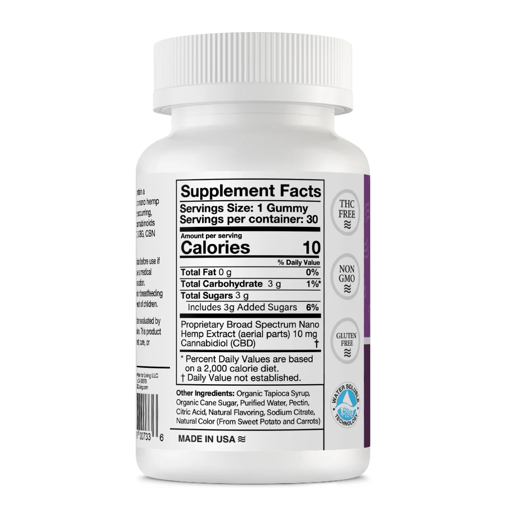 CBD Living Gummies are the most delicious way to get your CBD. Strawberry Flavor - each gummy contains 10 or 25 mg of Broad Spectrum Nano CBD, along with 10 calories and just 1 gram of sugar, along with being Vegan.