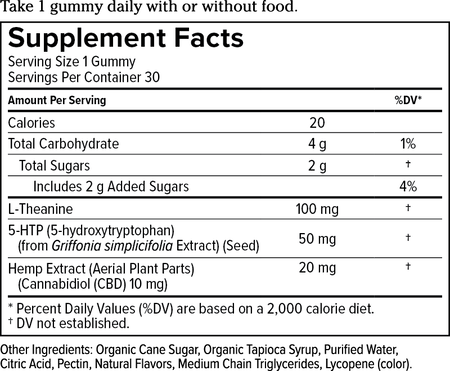 L-Theanine (100mg), 5-HTP (50mg), Organic Cane Sugar, Organic Tapioca Syrup, Purified Water, Citric Acid, Pectin, Natural Flavors, Medium Chain Triglycerides, Lycopene (Color)