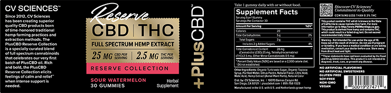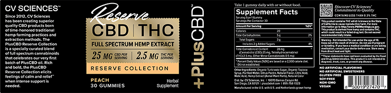 +PlusCBD Reserve Collection Hemp Extract Gummies offer consistent servings of CBD in delicious fruity flavors that are sure to make your mouth water. Our Reserve Collection Gummies are available in a 10:1 CBD to THC ratio for a balanced cannabinoid supplement. Experience less sleeplessness, quicker recovery, deeper relaxation, and a brighter mood with +PlusCBD Full Spectrum Hemp Extract Gummies.*When it is time to unwind, these CBD gummies are a delicious way to enjoy convenient, premeasured servings of full spectrum hemp. Tasty +PlusCBD Reserve Collection gummies are available in naturally flavored Peach or Sour Watermelon and use only organic sweeteners.