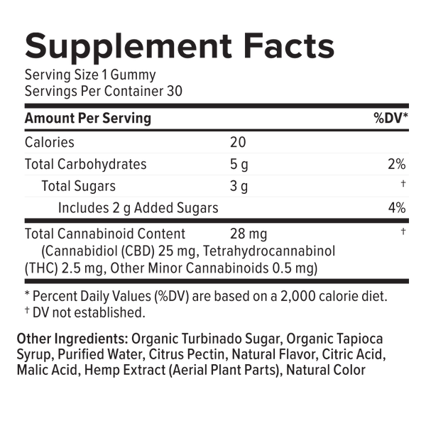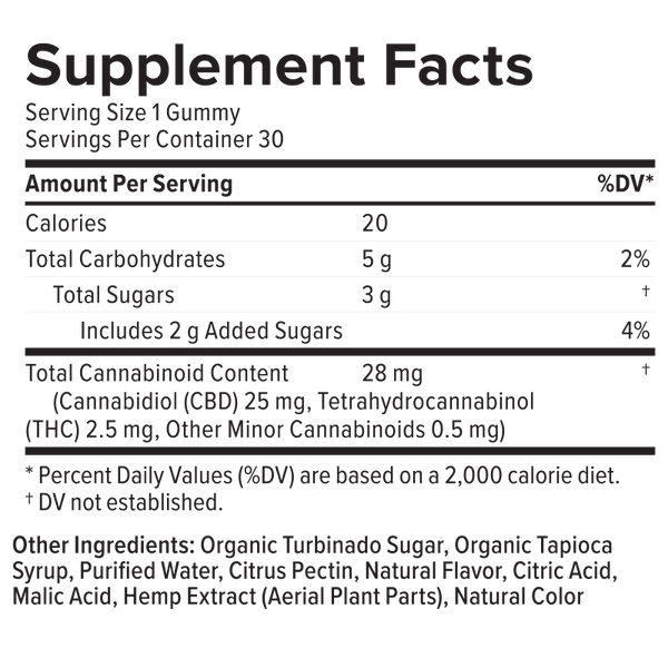 Organic Turbinado Sugar, Organic Tapioca Syrup, Citrus Pectin, Citric Acid, Malic Acid, Full Spectrum Hemp Extract, Natural Colors and Flavor